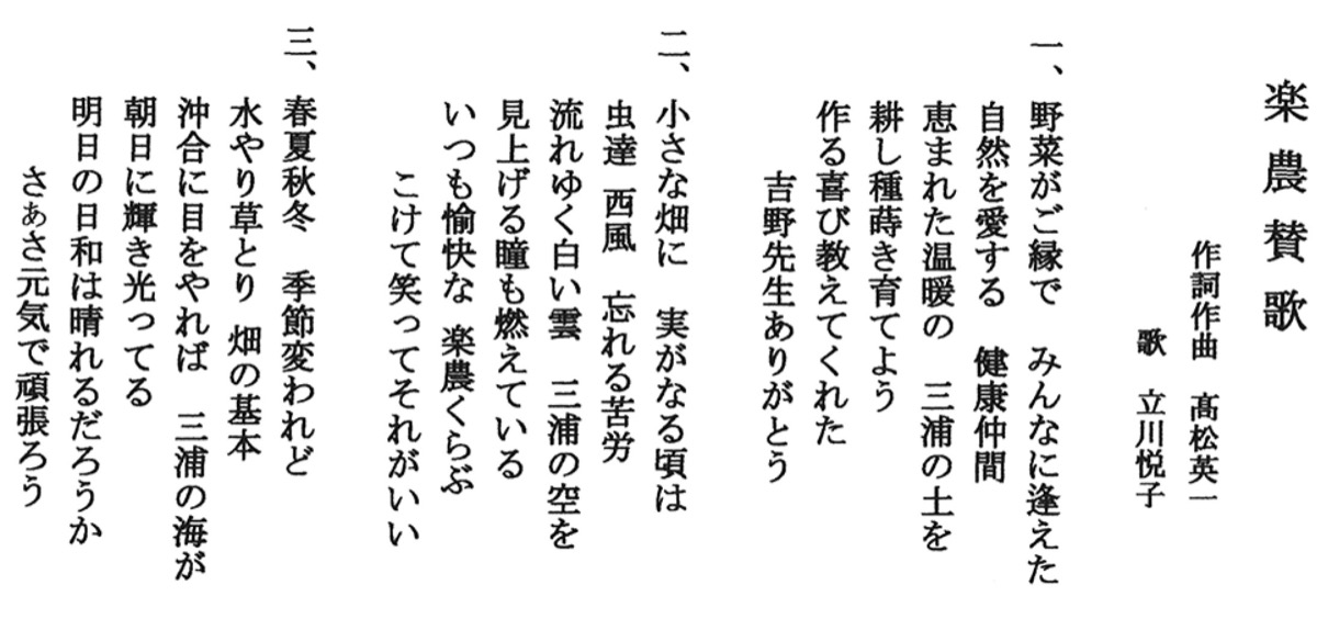「みうら楽農くらぶ」は2000年3月に発足し、会員は60人超。「趣味の農業」のほか、市社会教育講座「親子農業体験教室」での指導、三浦初声高校での授業補助なども行う。昨年発足20周年を迎えたのを記念し、会長の高松さんが会歌「楽農賛歌」を作詞作曲した=写真下。