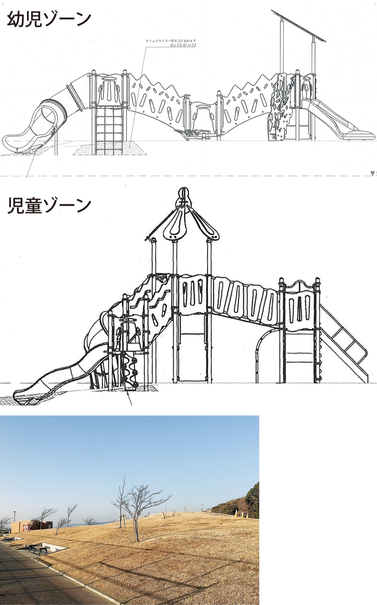 幼児用と児童用の2種類を整備。いずれも耐塩害の材質で、設計図によると、すべり台、うんてい、ネットやロープクライミングなどが一体となっている。