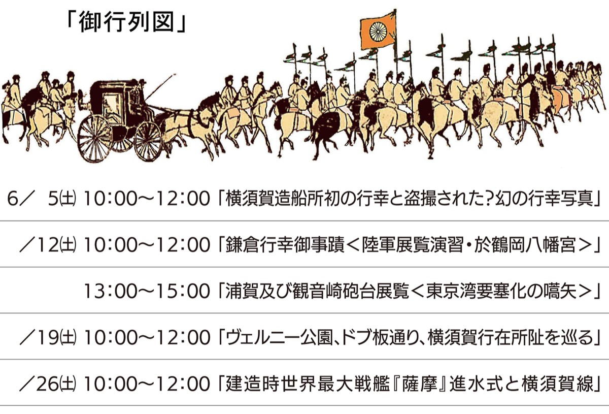 今回の講座では、多面的な角度から横須賀行幸の知識を深める。ゆかりの地を巡るフィールドワークもある。日時と概要は上表参照。講師は同会代表の長浜つぐお氏が務める。会場は西逸見町(逸見駅から徒歩5分)の横須賀市生涯学習センター5階「まなびかん」第1学習室。受講料3500円。定員45人で先着順受付。