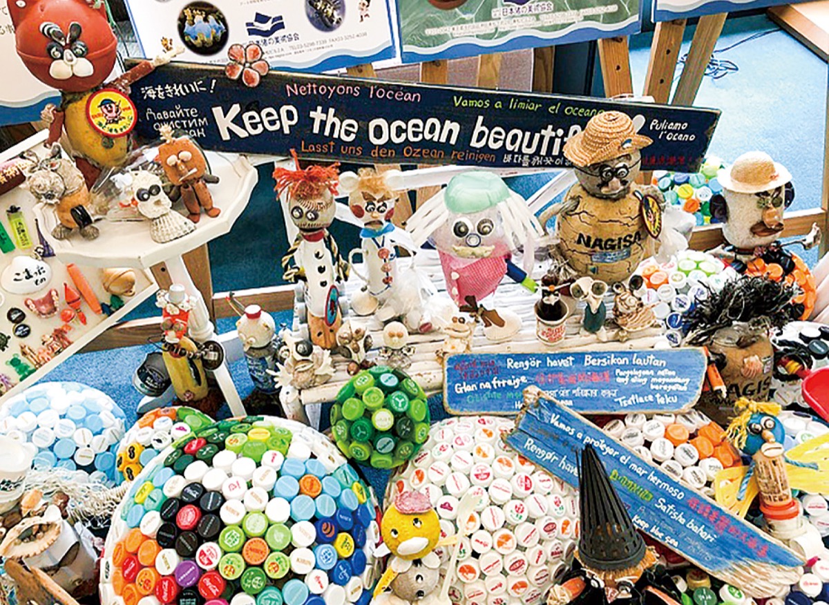 同協会は2000年に設立し、同海岸をはじめ全国で美化活動を実施。回収したゴミを「海からの贈り物」ととらえ、シーグラスや貝殻、流木などで「シーボーンアート」と名づけた作品を制作=写真下=し、体験会や展示会を催している。