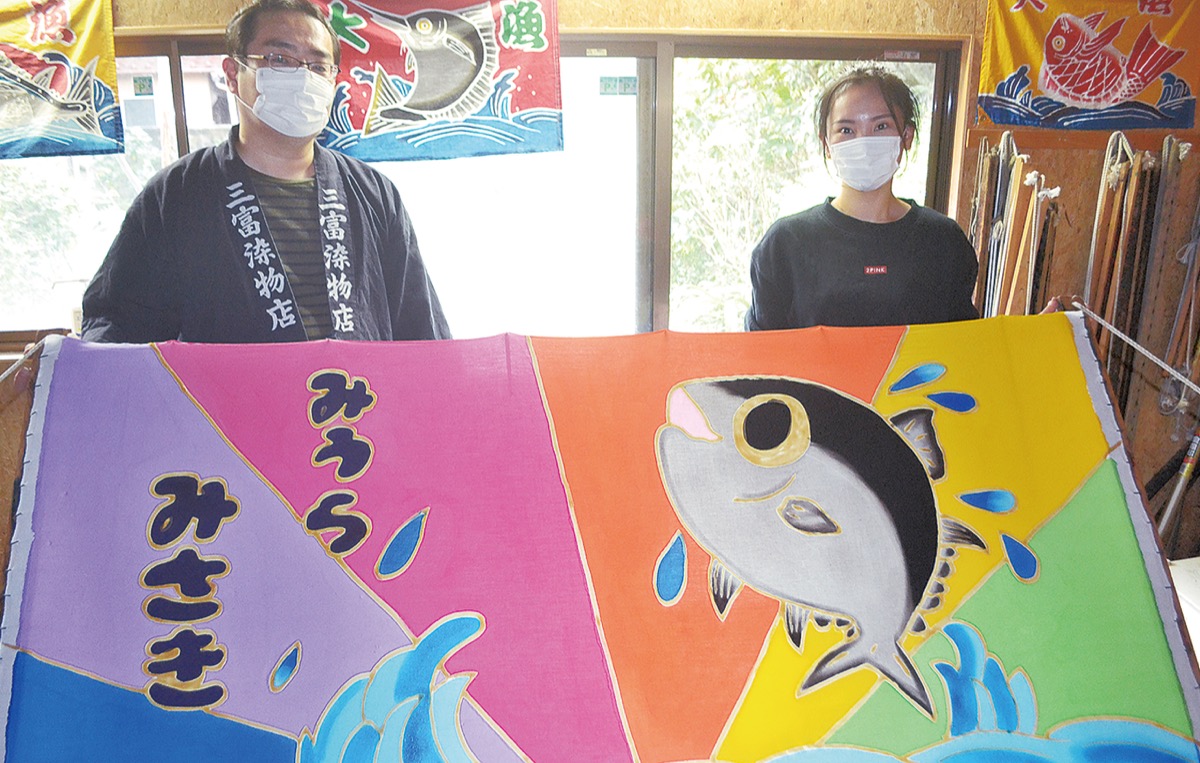 完成した大漁旗は11月1日、海南神社で航海安全や商売繁盛などを祈祷。その後、スバル興業に手渡され、にじいろさかな号に掲げられた。永塚さんは「自分がデザインしたものが形になって嬉しい。見た人に少しでも興味を持ってもらうきっかけになれば」と話し、完成を喜んだ。