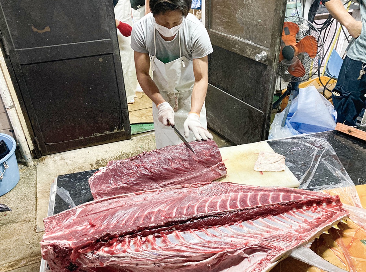 「今からまぐろを解体するよ、大間の生本まぐろ」。11月9日の朝、事務所でパソコン仕事をしていると、三崎でしらす漁を営む君栄丸の宮川元彦さんから一報が入った。これは素人でも分かる貴重な体験と、急いで加工場に向かったところ、即席の解体台と化した軽トラックの荷台に横たわり、丸々と太った腹を天に見せるまぐろがあった。聞けば、重さ147キロ。駆けつけた鮮魚店・活々水産の大庭剛さんが慎重な手つきでさばき始めた。「大型のまぐろの解体は、専用包丁を使うんだけどね」。従来扱わない魚種のため、出刃包丁などを駆使して巨体と格闘。包丁が骨にコツコツと当たる音が響く。その様子はインスタグラムでもライブ配信され、「ここがトロの部分」などと説明しながら、切りたての柵を見せていた。