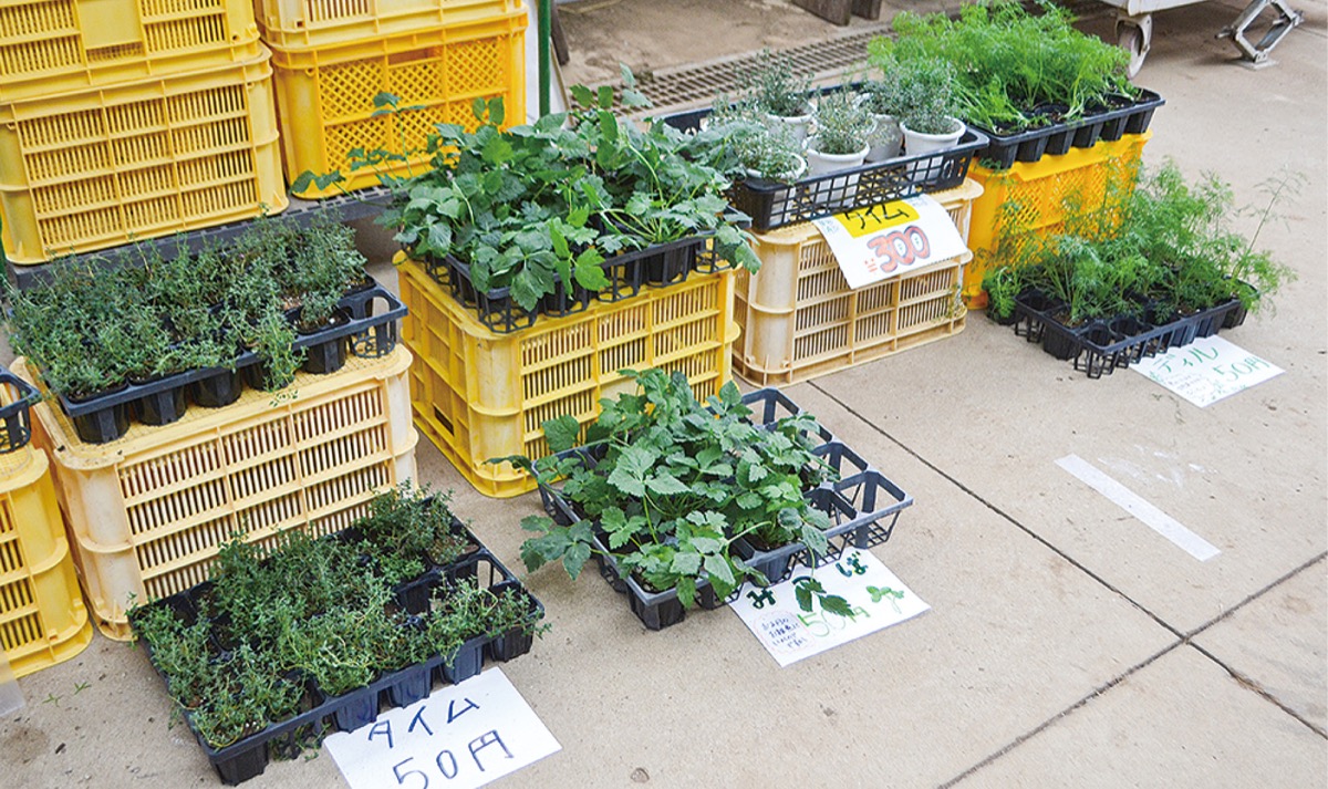 また、今年度からは新たにハーブの栽培にも挑戦。コロナ禍の巣ごもり需要により、庭がなくても簡単に育てられ、料理にも使えるハーブが市場で人気を集めていることから、タイム、パクチー、ディル、みつばのポット苗も販売する(50円〜)=写真。