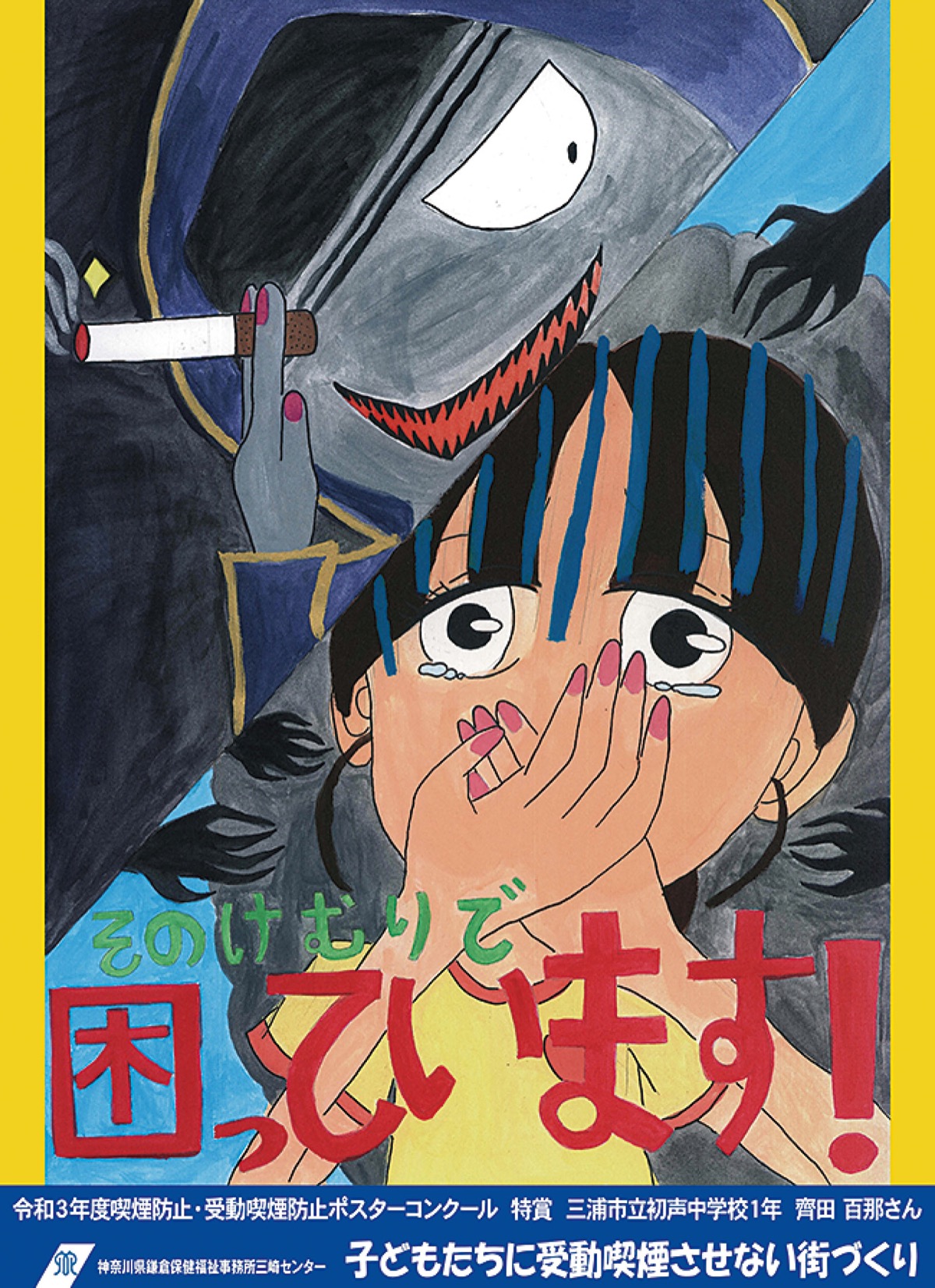 たばこによる健康被害や受動喫煙防止を啓発する「ポスター原画コンクール」で、初声中学校1年の齊田百那(ももな)さんの作品が特賞に選ばれた=写真。