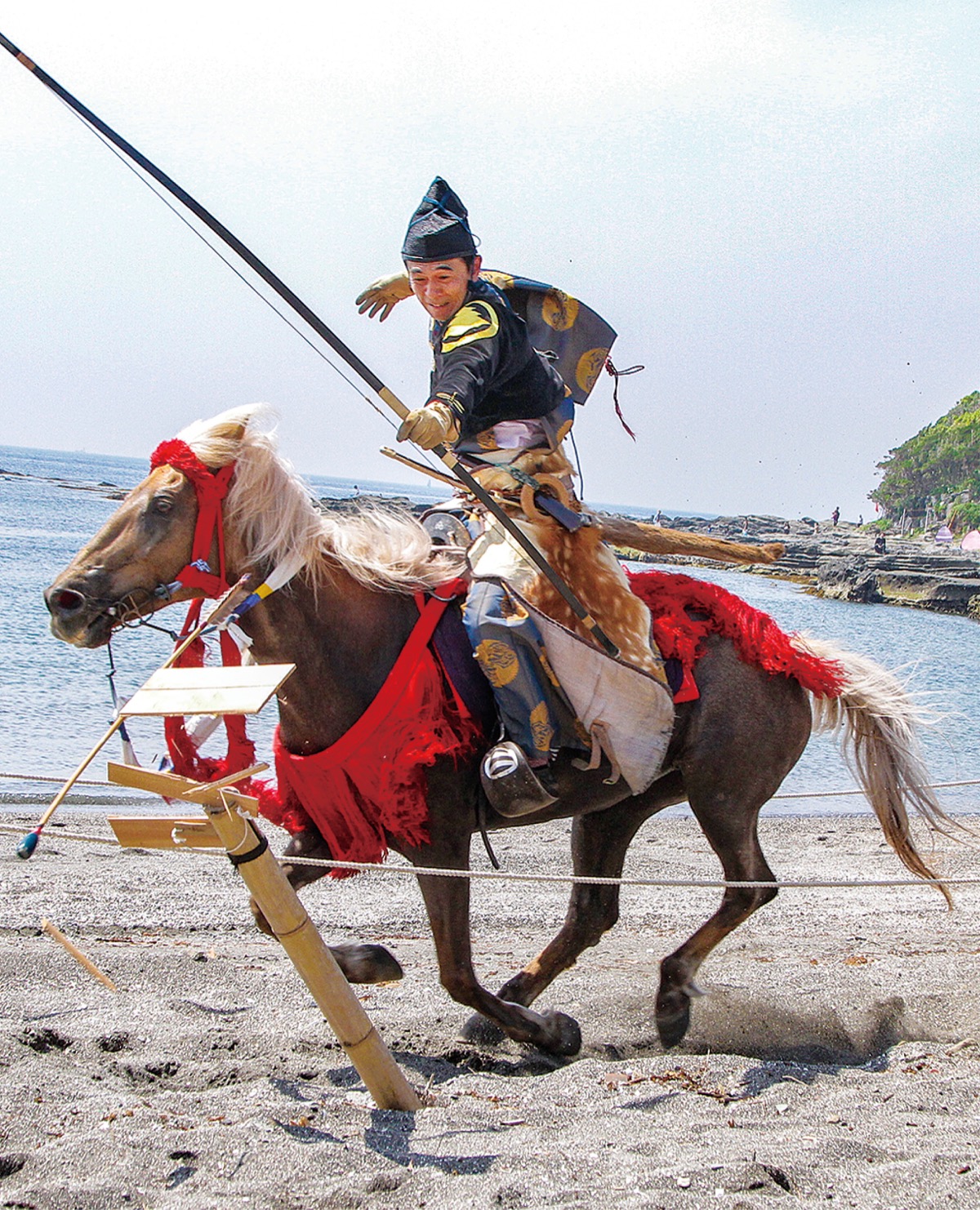 コロナ禍で一昨年、昨年と中止になったが、感染対策を講じたうえで、市や観光協会などでつくる実行委員会によって挙行されることになった。平安末期から鎌倉、室町時代にかけて流行した「流鏑馬」「犬追物」と並ぶ日本三大古弓馬術の一つ「笠懸」=写真/市提供=を披露することで知られる。源頼朝が三崎を訪れた際、三浦義澄や和田義盛などが競い合うように砂浜を駆け抜ける馬上から的を狙い矢を射ったとされ、三浦一族の”お家芸”として長く伝えられてきた。第1回目の開催となった1979年から行われている。道寸は戦国初期の武将で時代は異なるが、北条早雲との壮絶な攻防の末に落城、油壺湾に朽ち落ちたとされる悲話があり、現在放送中のNHK大河ドラマ「鎌倉殿の13人」の影響もあって三浦一族に改めて注目が集まっている。