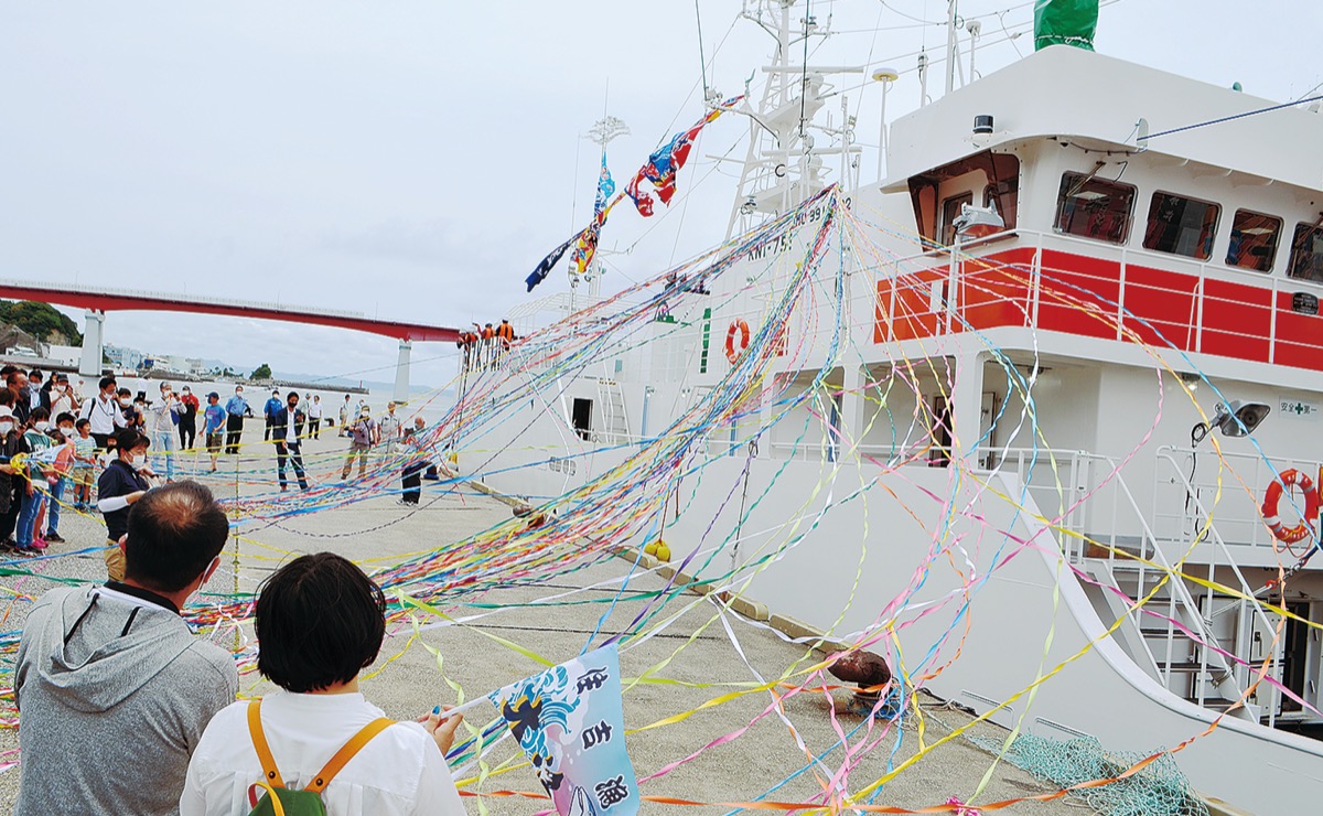 「乗組員の高齢化により人材不足が深刻」と磯前社長は、若手育成にも力を入れており、同船には海上技術短期大学校を卒業したばかりの小林航さんが乗り組んでいる。福岡県から訪れた母の美穂さんは「小さな頃からの夢が叶って良かったね」と少し涙ぐみながら、カラフルな大漁旗がはためく船に呟いた。