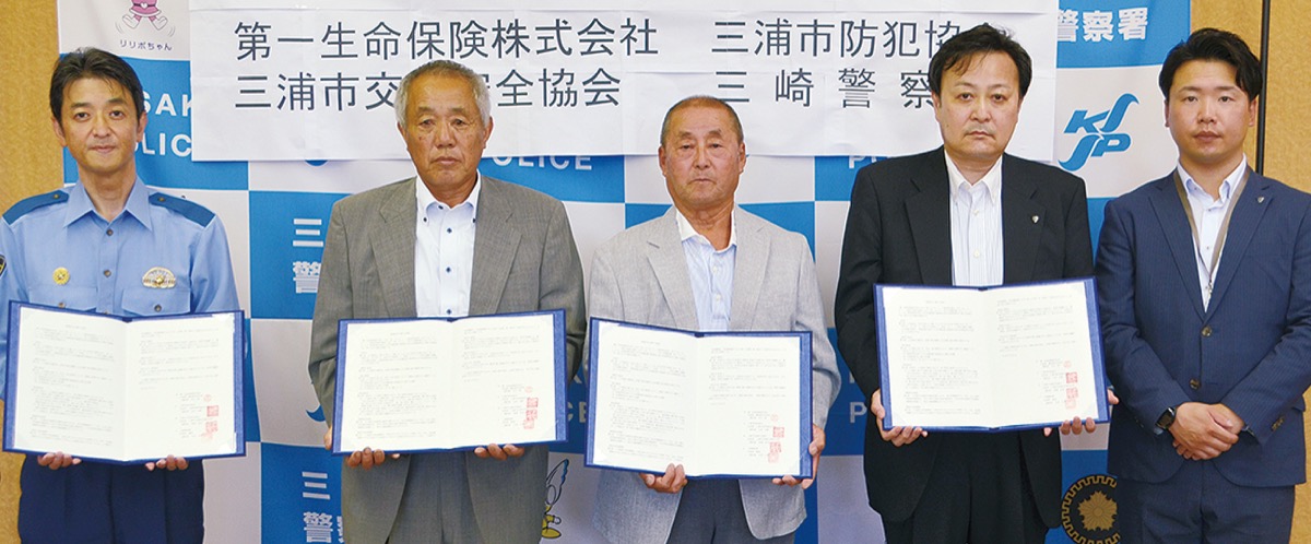 三崎警察署と第一生命保険(株)横浜総合支社(井上聡支社長)、三浦市防犯協会(山田光雄会長)、三浦市交通安全協会(高梨和吉会長)は7月25日、特殊詐欺を始めとする各種犯罪被害や交通事故を防止を目的に「地域安全に関する協定」を締結した。