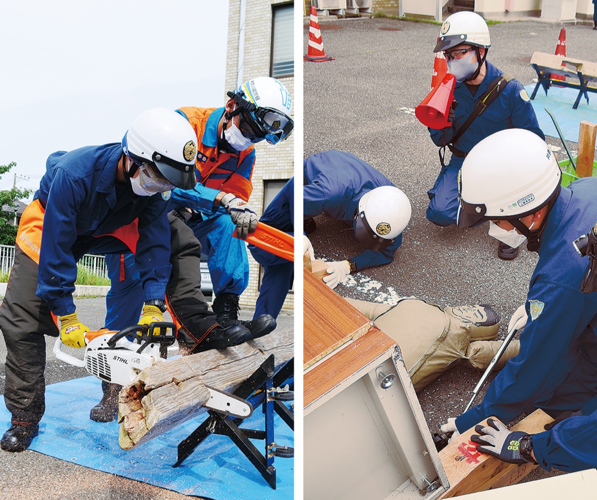 訓練内容は、大雨によって土砂災害が発生し、倒壊した建物の下敷きになった住民を救出するという想定で行われた。神奈川県警察本部の危機管理対策課即応対策チーム指導のもと、チェーンソーで角材を切り落としたり=写真左=、車用ジャッキで隙間を作って=写真右=大きな棚の下敷きになったダミー人形を運び出したりした。