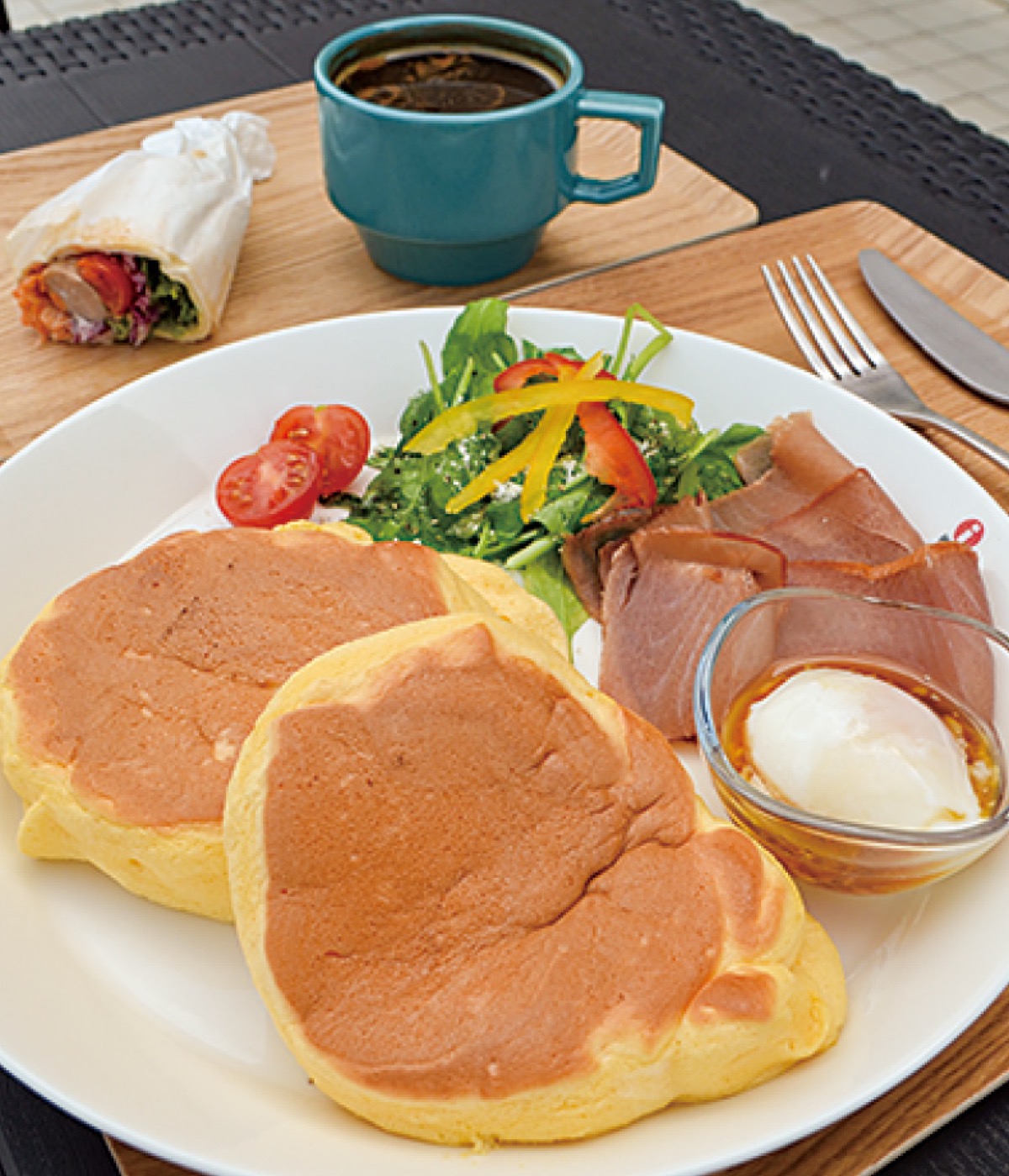西松の生ハム、スモークファームのソーセージ、安田・山本養鶏場の卵など地元で採れた新鮮な食材にもこだわった。米粉100%のスフレパンケーキやラップサンドが看板メニューで、近隣で飲食業に携わるmashukaの清水優香さんらが季節感あるメニューを監修。三崎恵水産のまぐろコンフィといった土産品も充実している。