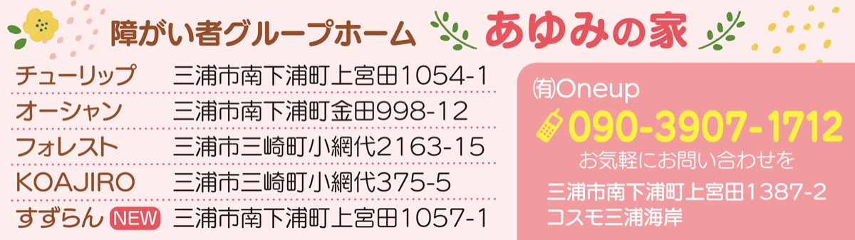 「すずらん」は、三浦半島を拠点に訪問看護や民間救急事業など「あゆみグループ」を展開する(有)One up(飯島徳貴代表)が運営。「チューリップ」「オーシャン」「フォレスト」「KOAJIRO」に続く5施設目で、世話人のほか、看護師やヘルパー約50人が利用者の健康面を管理する。夜勤スタッフも在籍するなど、福祉事業に携わる同社ならではの安心感が特徴だ。ストレスの緩和や心のケアに繋げようと、いずれの施設も海を間近に感じられる自然豊かなエリアに位置している。料金例としては、特定障がい者特別給付費の支給や自治体からの補助を受けた場合、31500円〜45500円が月額の負担額となる。