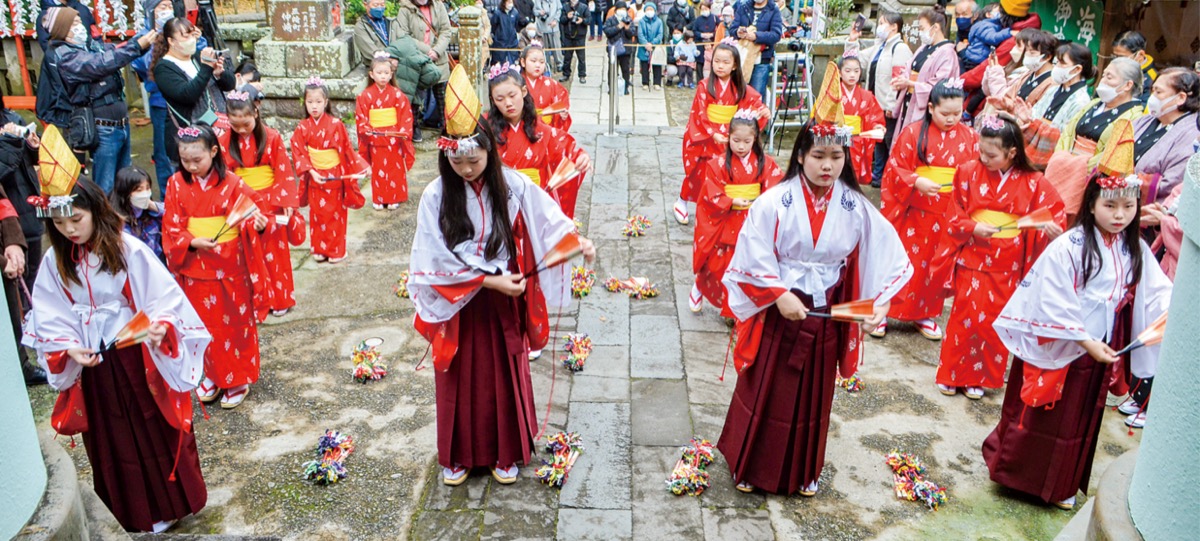 豊漁・豊作、海上安全、商売繁盛を祈願する「チャッキラコ」が、1月15日(小正月)に海南神社ほかで行われ、小学生18人が舞を披露した。