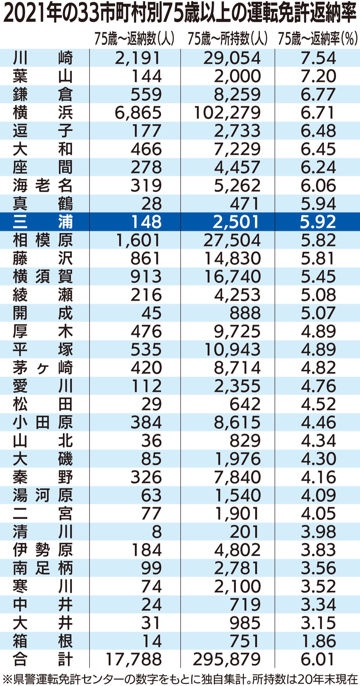 後期高齢ドライバーの運転免許返納状況についてタウンニュース社がこのほど、県内33市町村を対象に調査した。三浦市で2021年に自主返納したのは、75歳以上では免許保有者の5・92%にあたる148人だった。約17人に1人が返納した計算で、県下10番目、県平均の6・01%を下回った。また、自治体間では最大4倍の地域差があることも明らかになった。
