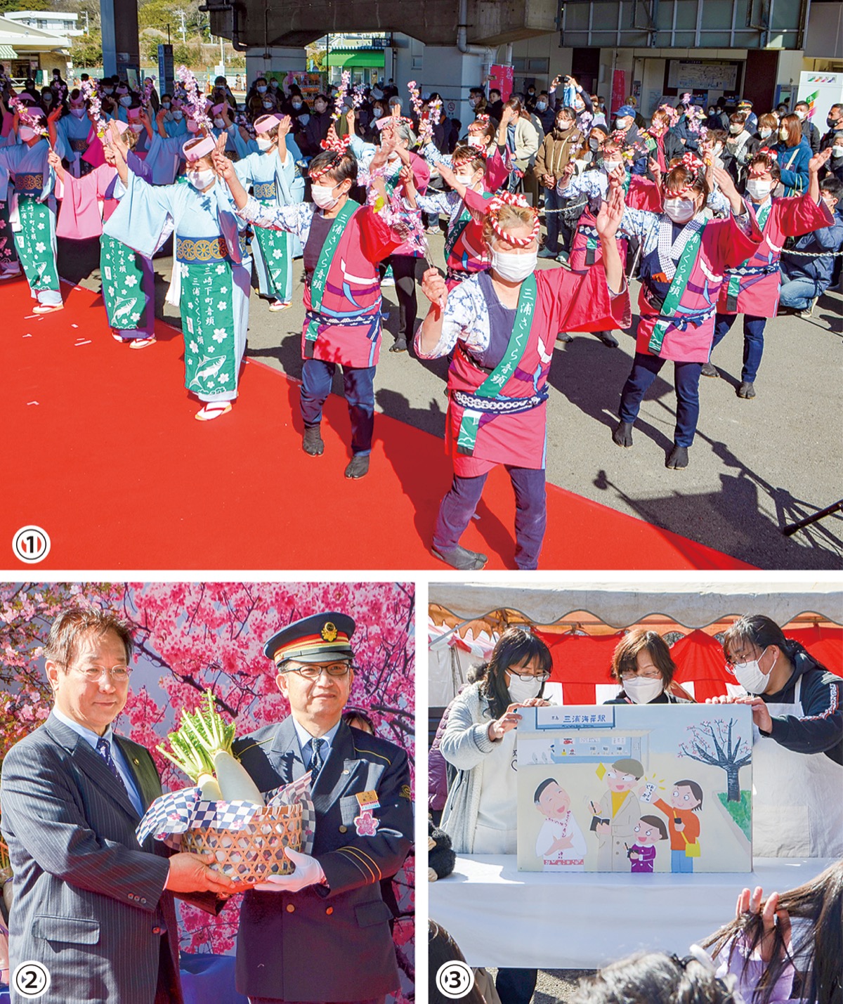 市内外から約30万人が来場する桜まつりは、三浦市を代表する観光行事。19回目を数える今年は、寒波のため開花は遅れ気味だという。式の冒頭、イベントを主催する三浦海岸まちなみ事業協議会の西崎則雄会長は「コロナ禍で2年間、開催できなかった。感染対策を徹底し、安全安心のまつりにしたい」と挨拶。吉田英男市長は「桜は日頃の手入れが大変。地元の協力で維持されている」と感謝を述べた。その後、峯永利之三浦海岸駅長は「ウイルスに負けじと桜は花を咲かせている。たくさんの方々に身も心も満喫してもらえれば」と話し、吉田市長から三浦大根などの詰め合わせを手渡された。