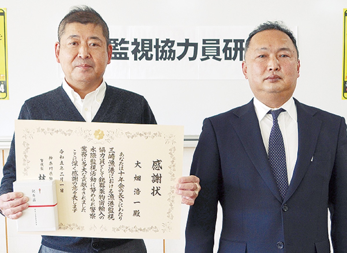 銃器・薬物の密輸入を水際で監視する活動に長年貢献したとして、神奈川県警察は2月1日、みうら漁業協同組合の職員である大畑浩一さんに感謝状を贈呈した。