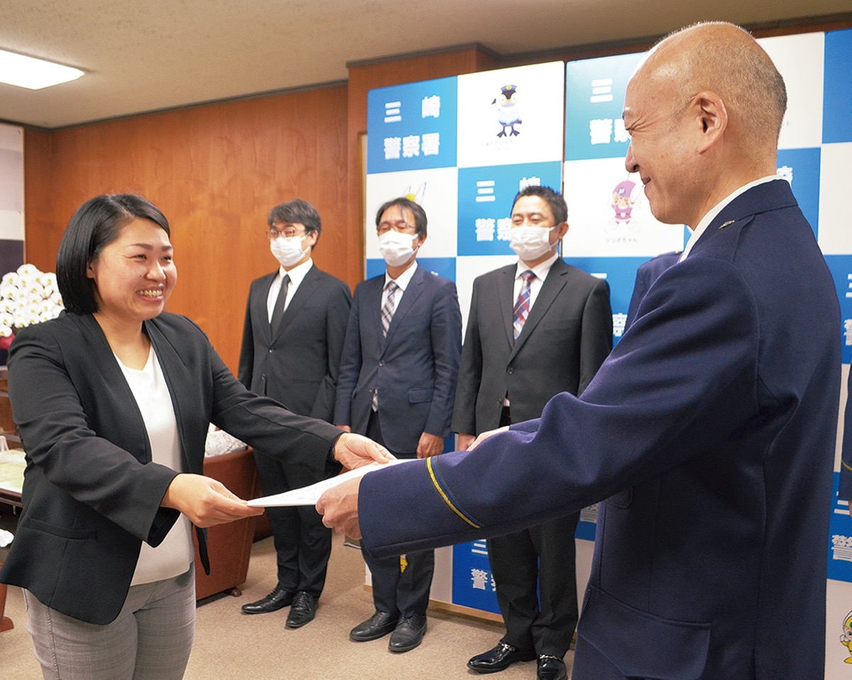 三崎警察署(平林貴志署長)は3月20日、行方不明になっていた80歳の女性を保護したとして、初声町三戸に住む会社員・進藤沙耶香さんに感謝状を贈った。
