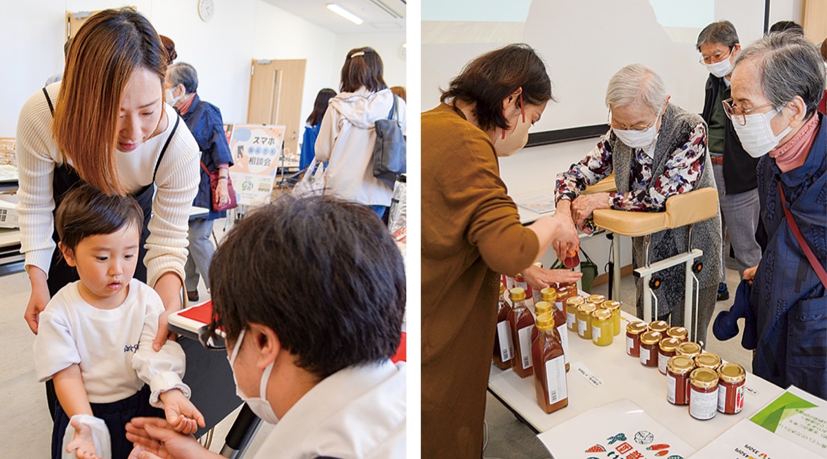 三浦創生舎が餃子、岩沢ポートリーが鶏卵、高梨農園がジャムを販売したほか、骨密度測定会やスマホ教室などもあり、子どもから高齢者まで多くに人で賑わった=写真。2歳の子どもと訪れた主婦は「3年前に移住してきたが、住民同士で情報交換できる機会は少ないので楽しい」と笑顔。同施設の三浦由紀副ホーム長は「市民が地元で穏やかに生活するためにはつながることが大切。そんな場を作っていきたい」と話し、今後は2カ月に1回のペースで同様の催しを展開していくという。次回は6月末に開催予定。