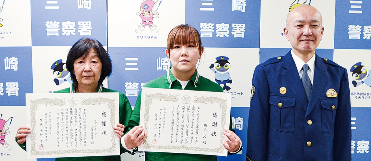 特殊詐欺被害を未然に防いだとして三崎警察署(平林貴志署長)は5月9日、セブン―イレブン三浦海岸店に勤める橋本茜さんと店長の目黒沢江さんに感謝状を贈った。