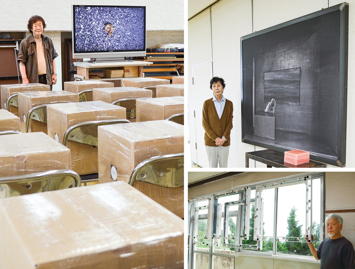 施設内には一風変わった作品がずらり。倉重さんは、一室に空のダンボールをいくつも並べ、砂浜の映像を流した。元美術の非常勤講師だった勝又さんは、アトリエに「鉛の部屋」を作り、防護服らしき姿の人物を写真撮影。大きな額の中に落とし込んだ。山岡さんは『コンストラクション フォー シー』(海のための構造体)と題し、窓辺に四角いフレームを設置。先には海が望める。