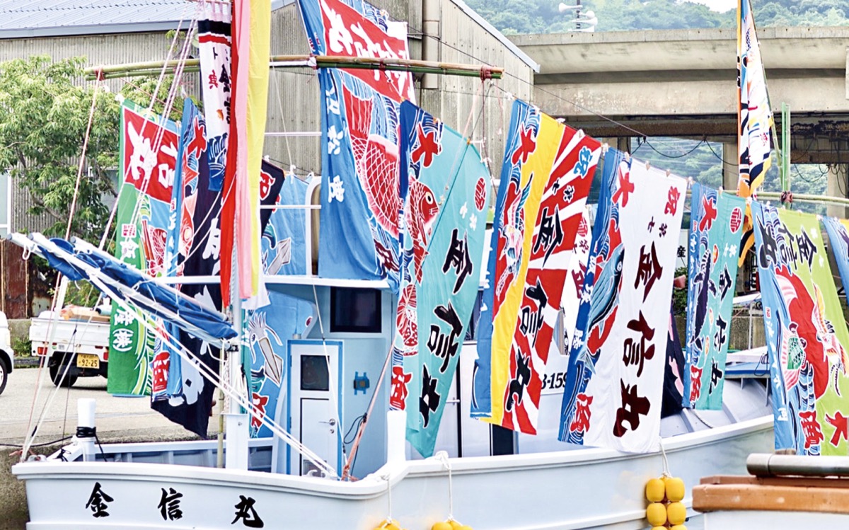 金田漁港で6月11日、「第七金信丸」=写真右=の進水式が開かれた。同漁港では約25年ぶりに造られた船で、乗組員や関係者らが大漁旗をはためかせたり、餅などを投げたりして、新たな門出を祝福した。