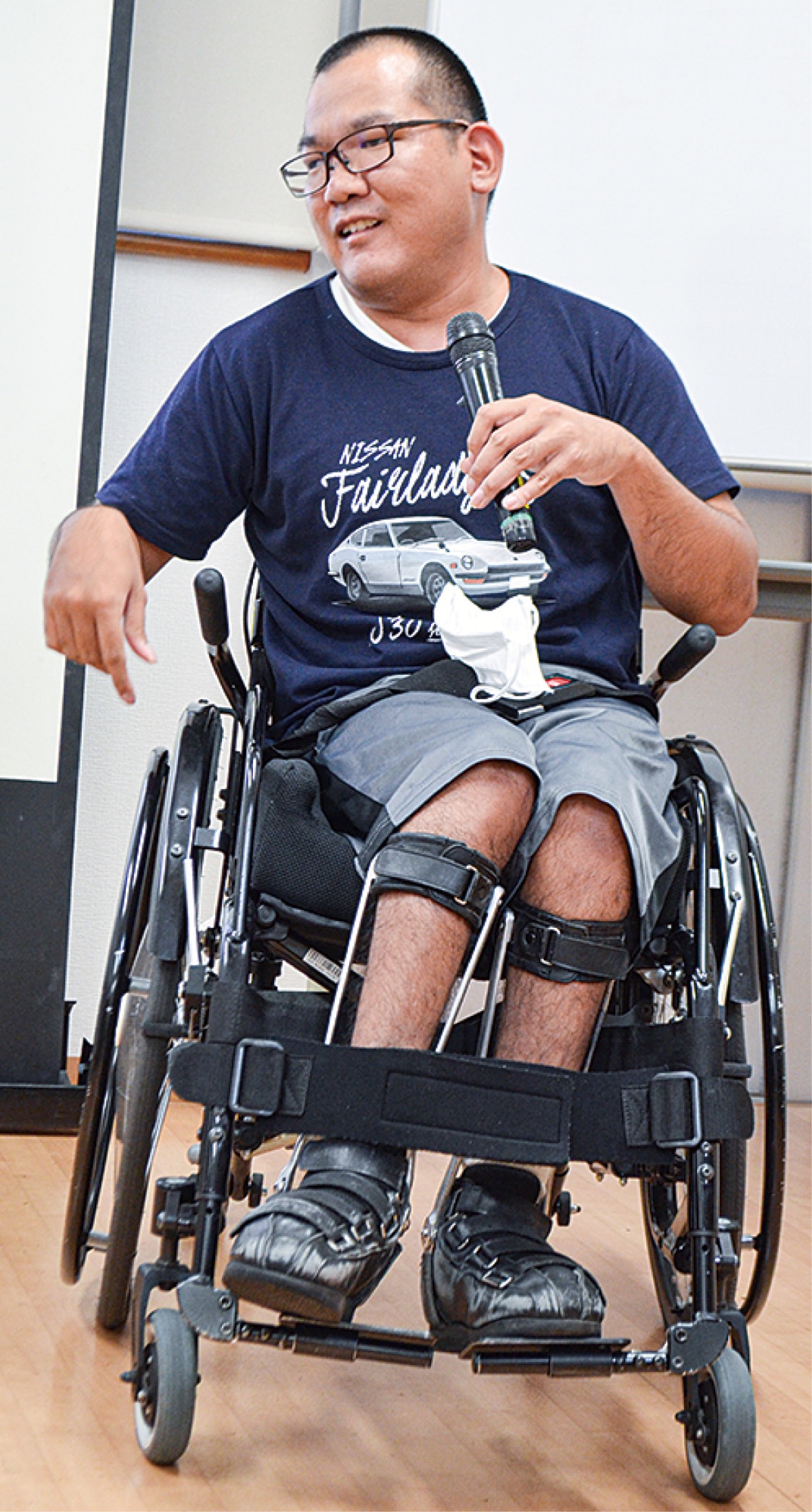 また、手すりのある多目的トイレを利用し、服を脱ぐのは自身で、着るのは家族に手伝ってもらい、入浴は全介助である現状も明かした。さらに、外食先で席が高い位置にあり、食事をとるのを諦めた経験を踏まえ、「身体の制約に縛られずに生きていきたい。コミュニケーションを大事にしてほしい」と話し、最後に受講者への一言を求められると「勉強を続けて障害福祉に携わってほしい」と呼び掛けた。