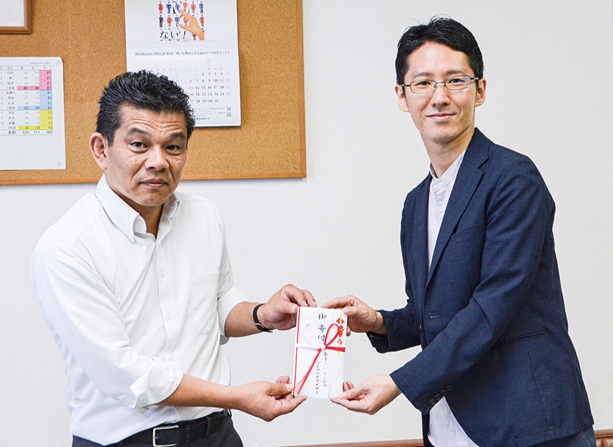 ゴスペルコーラスグループ「南青山ル・アンジェ ゴスペルクワイア―」のディレクター(指導者)を務める諸磯出身の長谷川繁さん=写真右=らは8月24日、三崎中学校を訪れ、三浦市中学校文化連盟で会長を務める小清水宣雄校長に約3万円を寄付した。