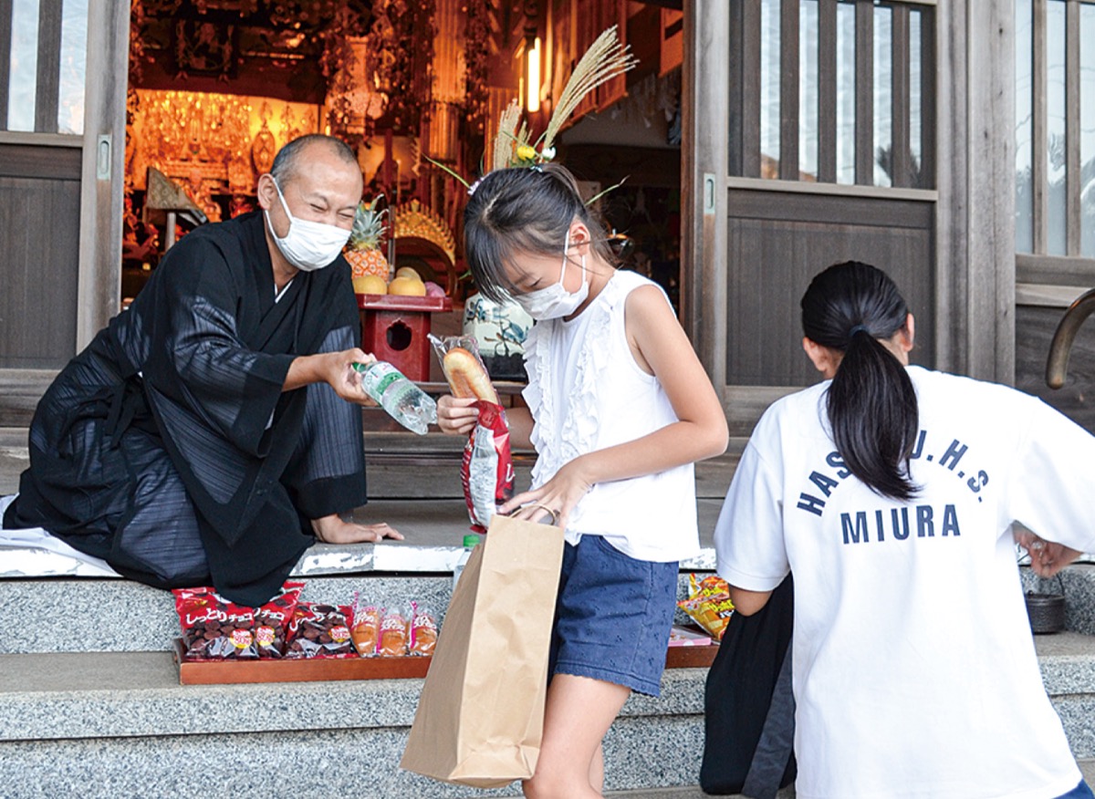 当日は同寺本堂前にお菓子やジュースなどが用意され、子どもは好きな物を持ち帰ることができる。なくなり次第終了。