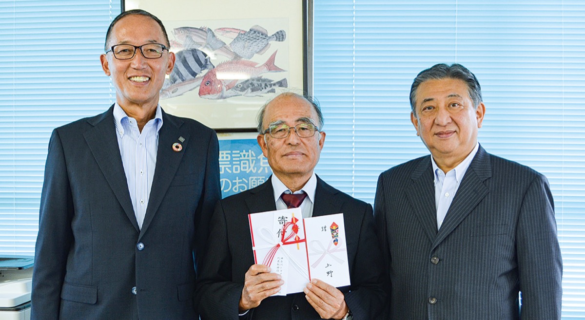 この日は、同社の黒田圭次郎社長や同グループの上野健彦代表らが協会施設を訪問。今井利為協会専務理事から食害魚により海藻が減少する説明などを受けた後、寄付金を手渡し、今後も支援を継続する意向を伝えた。