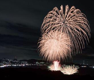 朝から雨が降り、「ダメか」と不安を抱いた市民らだったが、夕方にはピタリと止んで開催。水中花火やスターマインのほか、スイカや大根など三浦らしい花火もあり、会場に訪れた約3万人の顔を明るく照らした。