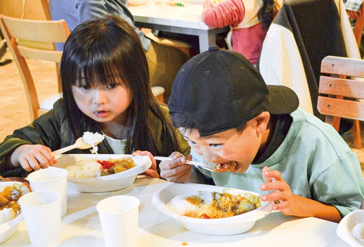 そのジャガイモを使用したカレーライスを高校生までの子どもは無料、大人は300円で食べられる「みんなの食堂」が9日、上宮田のカフェブルーシーズで開かれた。少年野球チームの子どもなどが訪れ、勢い良く口にかき込んでいた=写真右。あす16日(土)にも開催。午後5時から7時まで。50食限定。