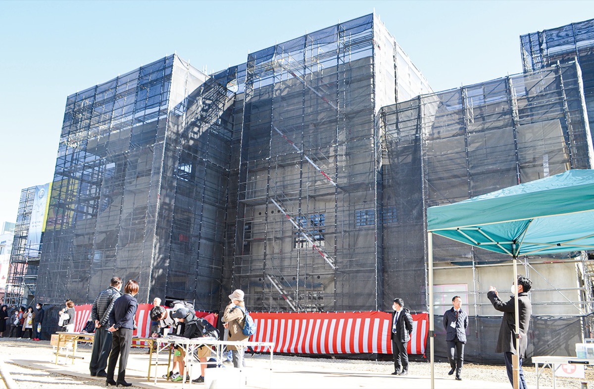 三浦市が旧南下浦市民センター跡地で整備を進める子育て賃貸住宅を含む複合施設の上棟イベントが12月17日、工事現場で行われた=写真。