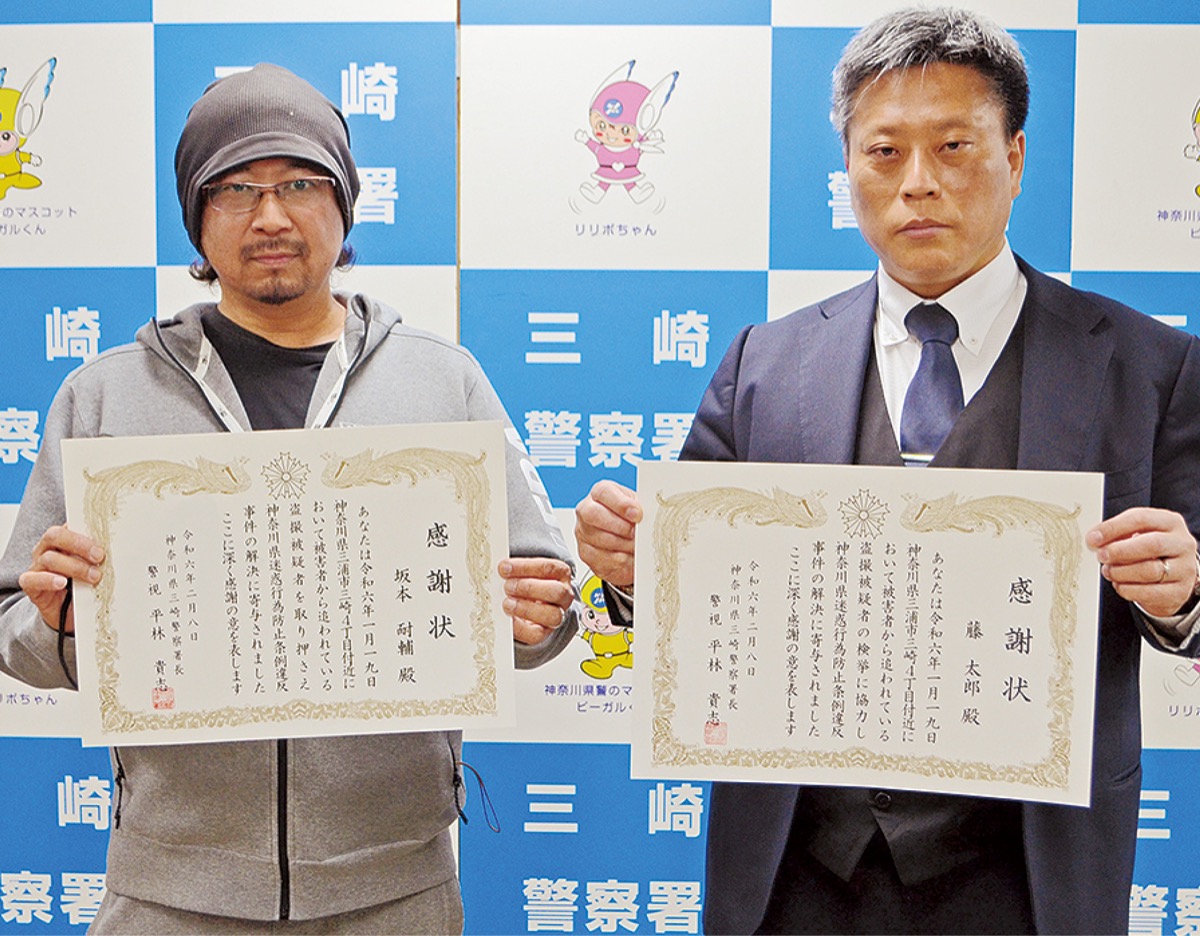 三崎署は2月8日、県迷惑行為防止条例違反(写真機等を人に向ける行為)事件の被疑者を検挙した青果店「八百重商店」の坂本耐輔さんと葬儀社「藤屋」の藤太郎さんに感謝状を贈呈した。