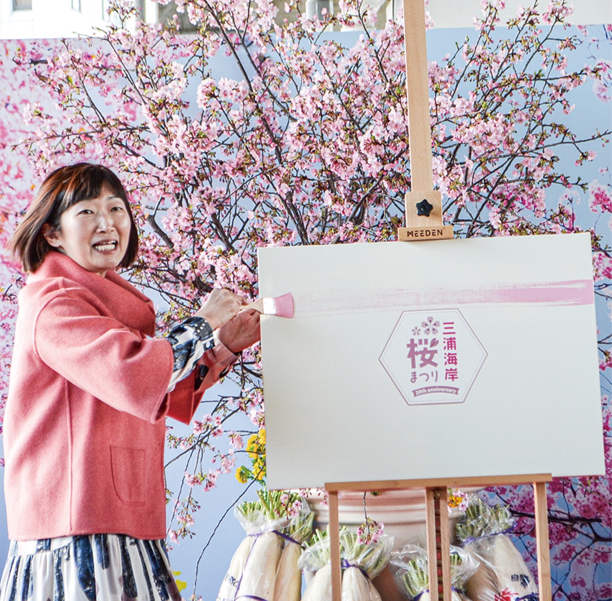 桜まつりは、期間中に約30万人が訪れる三浦を代表する初春の風物詩。式の冒頭、イベントを主催する三浦海岸まちなみ事業協議会の西﨑則雄会長は、桜を植樹した当時を振り返った後、「木も大きく成長し、きれいな花を咲かせるようになった。今後も桜まつりを盛り上げていく」とあいさつ。吉田英男市長は「地域の方々の手厚い整備のおかげで多くの人に見てもらえるようになった」と感謝を述べた。「みうら観光大使」に昨夏就任したお笑いコンビ「たんぽぽ」のメンバーである川村エミコさん(小網代出身)も登場。「桜だけでなく、電車やグルメなど、思い出になる素敵な体験をして」と呼びかけた。その後、川村さんと吉田市長が峯永利之同駅長に三浦大根を贈呈したほか、来場者が「三浦の魅力」をテーマとしたキャンバスアートにも挑戦。景色(ピンク)、グルメ(緑)、レジャー(黄)から色を選び、一筆ずつ書き加えて作品を完成させた。同作品は現在、駅構内に展示中だ。