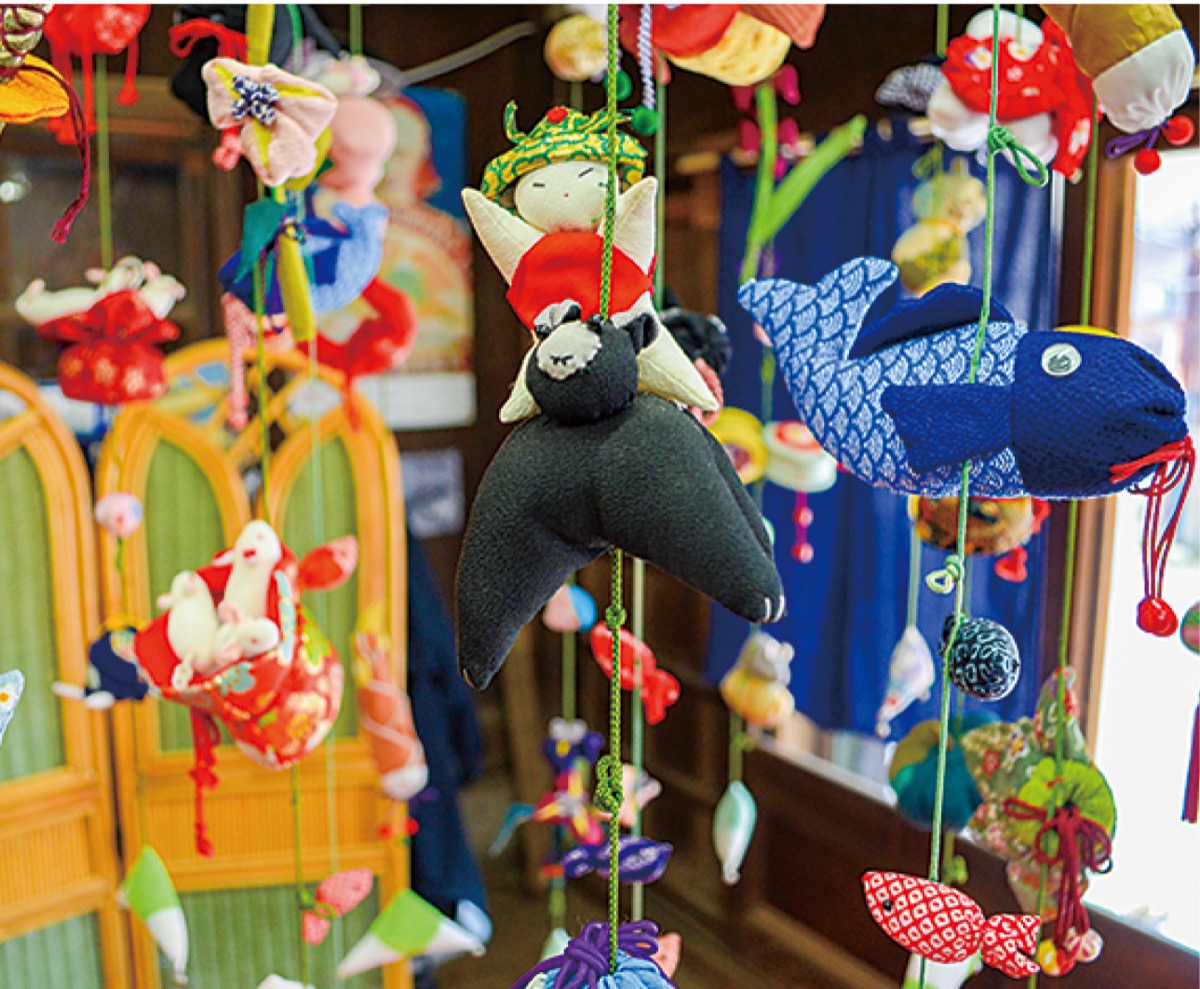 館内には、市民から譲り受けた1937(昭和12)年から1976(同51)年頃までの兜・鎧飾り=写真右=や同館スタッフが手作りしたユニークな吊るし飾り=写真左=が並び、来館者の目を楽しませている。