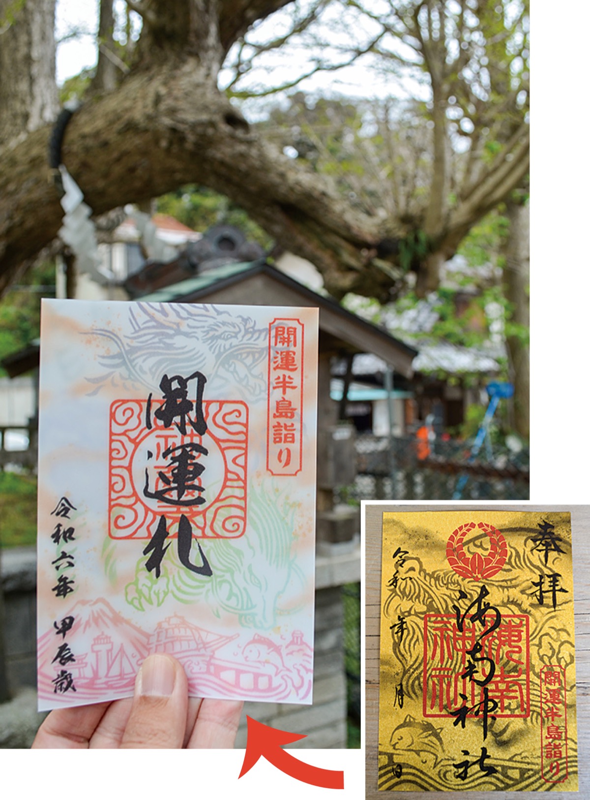 3社の「御朱印」は、龍があしらわれた金色。全て揃えると特別に奉製した「開運札」が授けられ、見る角度で絵柄が変化したり、立体感が得られたりする。初穂料は各500円。限定配布、なくなり次第終了となる。