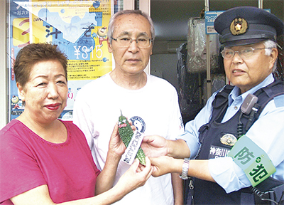 逗子警察署はこのほど、同署正面に設置されている「緑のカーテン」から収穫されたゴーヤを使って振り込め詐欺防止のキャンペーンを行った。