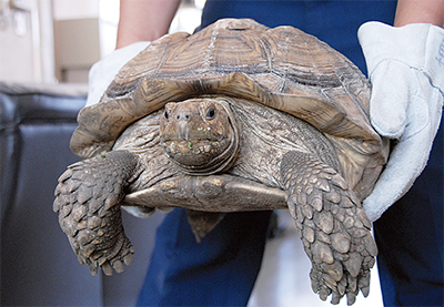 逗子警察署はこのほど、同市沼間在住の男性の通報を受け、同宅の庭で雑草を食んでいたカメ=写真=を捕獲した。一見怪獣のようなこのカメ。「ケヅメリクガメ」という種類で特撮映画「ガメラ」のモデルにもなっているそう。本来砂漠周辺やサバンナなどに生息する外来種であることから「野生ではないだろう」と捕獲後、同署が保護。一時的に預かっていると数日後、飼い主の女性が同署を訪れ行方不明になっていた「チビちゃん」だったことが判明した。どうやら日中に垣根を乗り越え、隣家に迷い込んでしまっていたらしい。