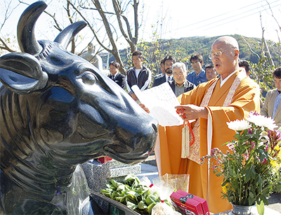 慰霊碑は葉山牛をモチーフにした台座が特徴的で大きさは高さ1・7m、幅2・5mほど。牛供養では台座に果物や野菜などが供え物がそえられ、同寺の住職が供養のための経を読み上げた後、参加者らが一人ひとり、慰霊碑の前で手を合わせた。同町上山口で葉山牛の飼育を営む石井廣さんは「葉山牛は私たちの生活から切り離せないもの。日ごろの感謝と敬意を込めて祈った。安らかに眠ってほしい」と話した。葉山牛は三浦半島で飼育された黒毛和牛。現在4戸の酪農家が飼育しており、年間200頭ほど生産されている。