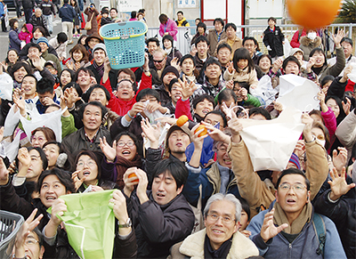 小坪漁業協同組合(高橋豊組合長)の主催で毎年行われている伝統行事。会場には家族連れなどおよそ600人が集まり、賑わいを見せた。メーン会場でみかん投げが始まると会場に集まった人はトラックの荷台から放られる”福”を掴もうと「こっち、こっち」と歓声を上げながら懸命に手を伸ばした。中にはより多くみかんをキャッチしようとカゴや袋を高々と掲げる人の姿も。