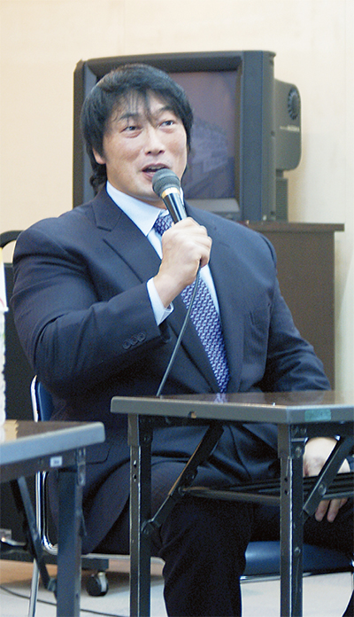 介護従事者などを対象にした家庭介護講座「介護を頑張っているあなたへ〜がんとの闘いを通じて伝えたいこと」が3日、葉山町福祉文化会館会議室で行われた。同町社会福祉協議会が主催。プロレスラーの小橋健太さんが講師を務め、自身の経験を振り返りながら介護する側やされる側の心の持ちようなどについて語った。