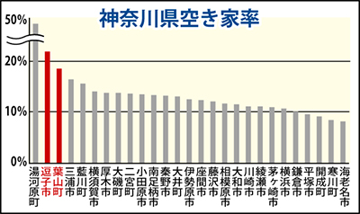 総務省が5年に1度行っている統計調査によれば、2008年時点での逗子市の空き家率は22・9%、葉山町は18・1%。逗子市は県下2番目、葉山町は次いで3番目で、両市町とも全国平均13・1%、県平均の10・5%を上回る。逗子市に限れば単純計算で5軒に1軒が空き家という計算だ。総務省が1958年以来調査を始めて以来、空き家率は増加の一途を辿っており、今後両市町でも数値が上がっていくことが予想される。