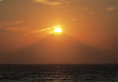 ダイヤモンド富士は富士山の東西に位置し、空気が澄んでいるなど気候条件が整わないと見ることができない。観測機会も1年を通じて4月上旬と9月上旬のわずか2回と宝石さながらに希少なことから写真愛好家らからも人気が高い。富士山の東側に位置する逗子葉山から観れるのは夕暮れ時の「落ち日のダイヤ」。国土交通省関東地方整備局では、関東地域のダイヤモンド富士の観測地点をホームページ上で紹介しており、両地域のポイントや目安となる日付も同HPに掲載している。逗子市では披露山公園(4月4〜5日)、大崎公園(5〜6日)、逗子海岸(同)、葉山町では葉山港(6〜7日)、森戸神社(8〜9日)などがあげられている。詳しくは同HP(「関東の富士見百景」で検索)まで。