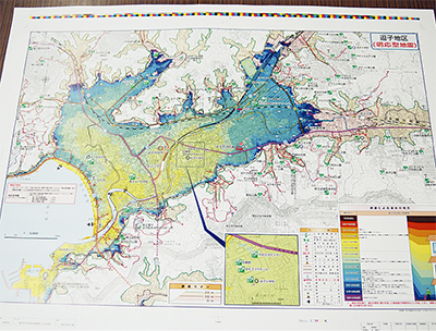 マップは両面刷りでA1版のフルカラー。浸水による深度によって黄、緑、青など14段階に色分けしており、一目で浸水エリアが分かるようにした。これまでのマップでは沿岸部の一部地域が「浸水する」との予測を示していたが、今回の改訂版ではエリアと深度を大幅に見直し。小坪マリーナ周辺では最大10m以上の浸水予測が示されているほか、逗子海岸沿岸部では5mから7m、さらに市役所周辺など市街地でも田越川流域は「3階以上の高台への避難を必要」とする5m以上の予測が目立った。内陸部に位置する池子などの一部地域でも「人命に影響する恐れがある」に該当する0・8mから1・2mの予測が示されている。
