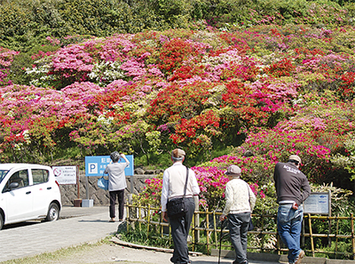 同公園に植栽されているのは、ドウダンツツジやキリシマツツジなど十数種類、約1万5千株。いずれも赤やピンク、紫など色鮮やかな花を開かせており、斜面を彩っている。