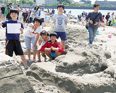 潜水艦に鯉のぼり、タコやイカに人気キャラクター。およそ2時間で砂浜には発想ゆたかな作品がずらりと並んだ。表彰では「ユニーク賞」や「ファミリー賞」など特別賞を含む22チームが入賞。最優秀賞には山の根キッズによる「わにのうんどうかい」=写真=が選ばれた。貝殻を牙に見立てるなど細部までこだわった作品は迫力満点でメンバーの女の子は「3位はあるけど1位は初めて。嬉しい」と声を弾ませた。代表の菅原正則さんも「小6の子が多く、卒業前のいい記念になった」と目を細めていた。