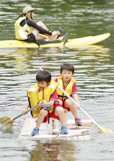 逗子市を流れる田越川の魅力を市民らに知ってもらおうと、廃材で作ったいかだで川を下るイベントが19日に行われた。逗子葉山青年会議所(田村誠悟理事長)の主催。当日はペットボトルや廃チューブなどで作った個性豊かな19のいかだが出艇。向かい風の中懸命にオールを漕ぎながらおよそ1時間かけ、約1・7キロ先の逗子海岸を目指した。親子で参加していた男性は「思ったよりきつい。明日は筋肉痛だな」と額に汗していた。兄弟で参加した春山博昭くん(9)と貴昭くん(7)は牛乳パック104個を繋いだ「ゴールへシュート号(GO)」を製作。息を合わせながら漕ぎ進め、無事1着でゴールすると「疲れたけど、楽しかった」と笑みを浮かべていた。