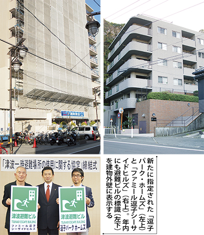 市では東日本大震災以降、公共施設の津波避難ビル指定や標高、避難経路の表示などを進めてきたが、民間マンションについては不特定多数が入ることによる安全面への懸念などから協力が難航。これまで市内約30カ所に要請してきたが、避難ビルとして指定されている民間マンションは小坪地区の4棟(昨年11月)にとどまっていた。今回の2棟が加わり、市内では計6棟になる。