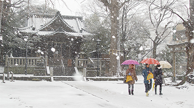 発達した低気圧の影響により関東地方全域で記録的な大雪となった14日、三浦半島でも今年2度目の降雪を数えた。逗子市や葉山町でも早朝から雪がちらつき、昼過ぎには次第に強まった雪であたり一帯が銀世界に。鉄道やバスの運行にも影響が出始め、駅前などには家路を急ぐ人の姿が目立った。すっかり雪化粧をまとった亀岡八幡宮=写真=を訪れていた40代の女性は「先週大雪が降ったばかりでこんなに降るなんて。また雪かきをするのが大変」と少々辟易した様子。50代の男性は「雪はもう十分。春が待ち遠しい」と話していた。