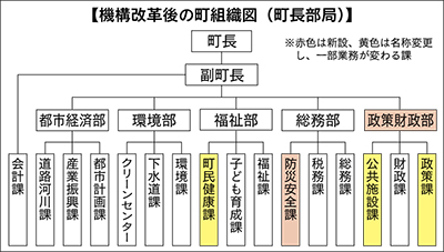 機構改革を巡っては、山梨崇仁町長が昨年度から重点課題と位置付け、「行政のスリム化を目指す」として昨年1月、管理職を除く11人の職員で構成される「機構改革検討委員会」に原案作成を諮問。同年5月に答申を受け、町は機構改革の骨組みを固めてきた。