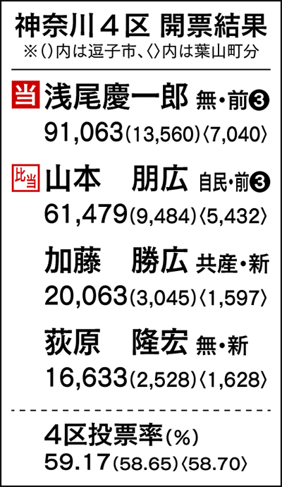第47回衆議院選挙は14日投開票され、県内18選挙区でも激戦が繰り広げられた。4人が立候補した4区(逗子市・葉山町・鎌倉市・横浜市栄区)では無所属前職の浅尾慶一郎氏(50)が自民前職の山本朋広氏(39)を振り切り、議席を死守した。