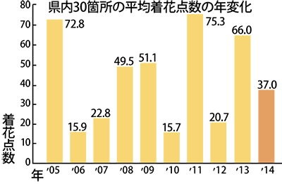 今回の平均値は37点で前年調査時の24点は上回ったものの、過去17年間の平均値43・2点は下回った。同センターによるとスギ雄花の着花形成は花粉が飛散する前年夏の気象条件との相関が高い。高温少雨で日照時間が多い時は着花形成が促進され、雄花が多く着く傾向があるという。昨夏は雄花が多くなる条件が整っていたが、気温が平年並みだったため、着花点数がやや低くなったとみられる。